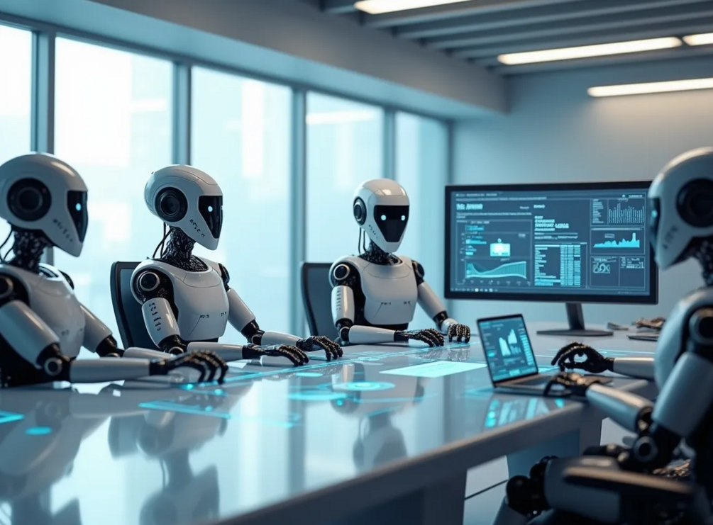 Image Prompt: "Create an engaging digital image of five anthropomorphized robots sitting around a modern, sleek conference table, equipped with futuristic technology. The setting is bright and clean, resembling a high-tech research center. Each robot has a unique design to suggest individuality, and they appear engaged in a serious discussion, with digital screens displaying complex data and graphs. The image should convey a sense of advanced technology and collaborative research."